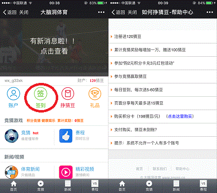 2.注册后免费赠送120猜豆,点击“签到”按钮,每天可免费获得5-60猜豆!