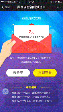 微医是本站曾经推荐过的一个平台,虽然这个不是理财平台,但每次送起钱来也是够简单粗暴的,新老用户均可免费领取,金额随机,最高有500元。我是老用户,只领到了2元红包,当然是这个红包是可以直接提现到银行卡的!