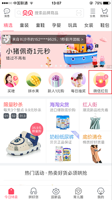 3.按提示下载贝贝app,用刚才的微信号登录,点击“今日特卖”-“微信红包”进入签到,首次0.5元,以后每天都有几毛。
