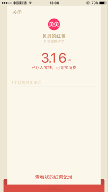 5.完成后,回到“微信红包”页面去申请提现,它提示你方法,其实就是关注“贝贝”微信公众号,回复“提现”即可。