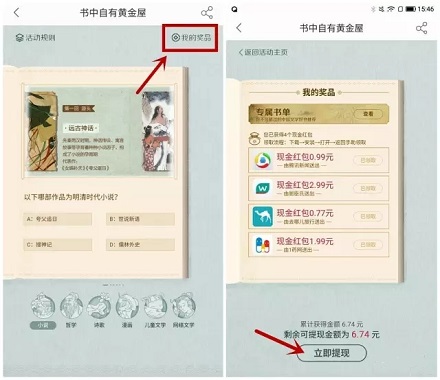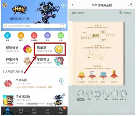 3.完成登录,点击首页的“赢金章”进入,先按提示参与答题,答案是D儒林外史、B易经、A关汉卿、C长眉、B魔方大厦、C云南虫谷。
