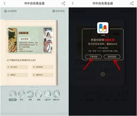 4.答对一题后,选择“下载领取”或者“继续答题”按提示完成下载领取红包。