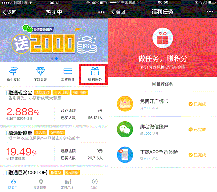 融通基金虽不上那些大基金公司吧,但也做过多次活动了,这次新老用户又有活动,可以通过注册绑卡,绑定微信,登录app获得的积分刚好兑换6元货币基金。当然是可以直接提现的,积分貌似不是即时到账,兑换的货币基金份额奖励次工作日到。