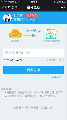 3.会第1步的页面,点击菜单栏“我的账户”-“积分兑换”即可把你的积分兑换成基金。