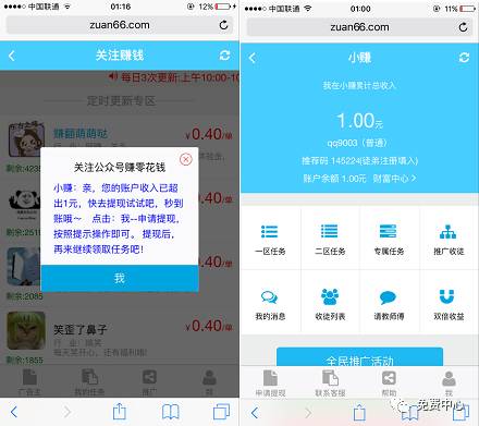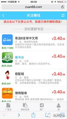 一区任务里都是关注微信的任务,每个0.1元,二区任务是一些注册类,单价也各不一样。三区任务里面都是阅读任务,每篇0.01元。