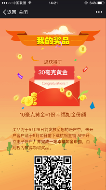 2.打开后可看到活动详情,进去玩个小游戏,一般可抽中20mg-50mg黄金,如果不中,随便分享给好友,又可以抽一次,我就是这个时候中的。