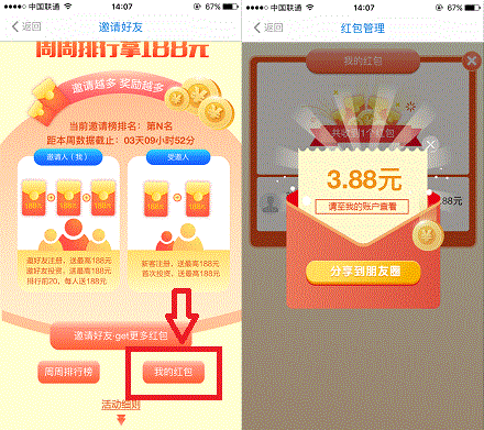4.购买成功后,会提示你获得一个现金红包,点击进入后,下拉找到“我的红包”拆开可获得3.88元-100元现金红包。
