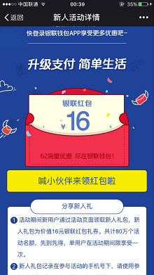 2.输入手机号领取16元红包,下载“银联钱包”app。