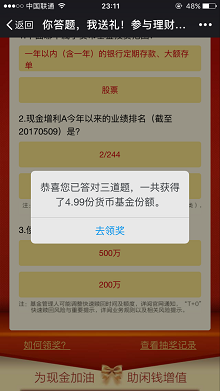 易方达基金最近联合民生银行做活动了,新老用户均可免费参与“你答题,我送礼,参与理财知识答题送货币基金红包”活动,一共3题,每题可中1-4888元。亲测我中了4.99元,新用户一般中的更多,奖励到账后可直接提现的!