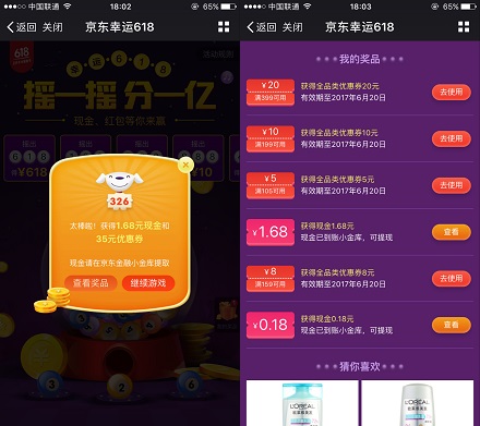 京东正在做“幸运618,摇一摇,分一亿”活动,咱们每天可免费摇奖3次,可抽中现金或者优惠券,至于中多少得看自己的运气了,中到的现金可以直接提现,中到的优惠券一般都是满多少减多少,除非你正准备在京东买东西,不然没多大用!
