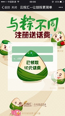 云投汇是云投汇众筹(北京)网络技术有限公司旗下的新兴的互联网股权融资平台,目前新用户通过活动页面注册即可获赠10元话费,有人已经到账了,后面的不确定是否能到账,只需要完成下实名认证,不用绑卡,速度上吧!