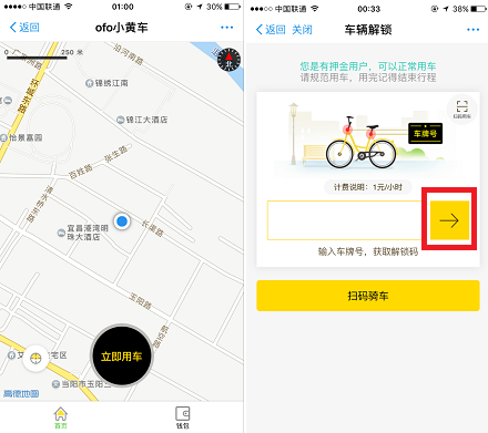2.首次使用会提示你交99元押金,放心这个押金在咱们领取完所有红包后,可申请秒退款的!交完后,点击立即用车,车牌号随便输4-8位,并点击旁边的箭头确认。