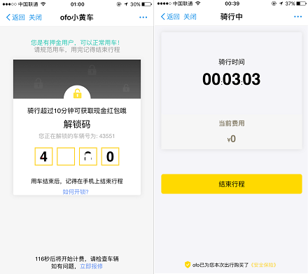 3.完成后,会弹出解锁码页面,无需理会等在那就行,下面有个倒计时,说多少秒后开始计费(其实5月30日前骑小黄车免费,这个在第一步那个活动页面也有公告的!),计时完后,再等骑行时间,规则说要5分钟以上才有红包,亲测其实3分钟就够了(建议还是多骑会,因为我最后一个红包没领到,提示擦肩而过,不知道是不是骑行的时间短了)。