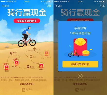 5.重复上面的步骤,一共要骑8次,分别在1、3、5、8次时可以去领取红包,分别是1.88、2.88、3.88、8.88元一共17.52元!