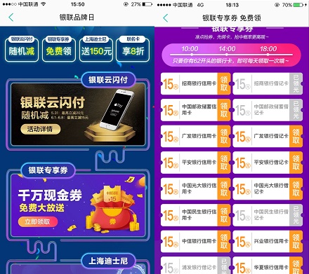 美团正联合银联举办“银联品牌日,千万现金券,免费大放送”活动,其中有个绑定指定银行的银行卡即可免费领取15元优惠券的活动,非常受欢迎,你可以直接在美团团购买东西,点外卖,买电影票等!只要满15.01元即可使用!