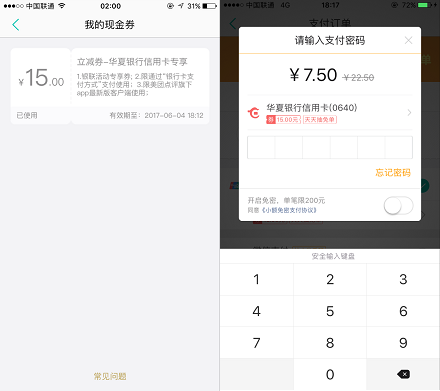 5.如图,刚好我有一张华夏银行的信用卡,所以领了一张正好点了外卖用掉券!