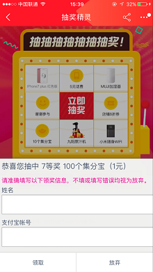 进入后,按提示直接抽奖,一般都可抽中至少100集分宝或者5元话费!
