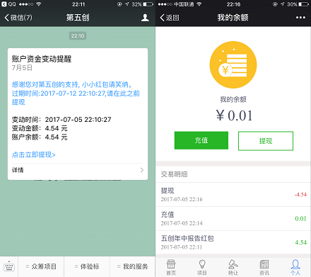 第五创是深圳创五板网络科技有限公司旗下的一家股权众筹平台,目前正在举办“五创年中报告红包”活动,新用户可免费领取5元左右,亲测我领到4.54元,绑卡需要是连连支付,需要充值0.01元,可直接提现,已经有人成功到账了!