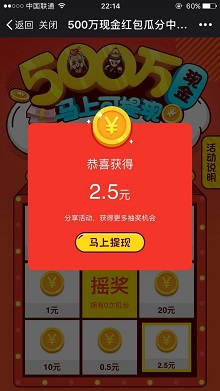 2.进入活动页面,点击“摇奖”一般都能抽中2.5元以上,分享一次还能抽一次,如果你抽到太少,建议放弃。