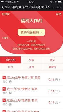 不知道大家还记不记得以前的小福有礼,就是在微信关注一些微信公众号后即可免费赚钱的小项目,由于操作简单,虽然赚得不多,但也很受大家喜欢。今天分享有蜂窝也是这样一个平台,关注一个公众号有0.11元,最低1元即可申请提现!
