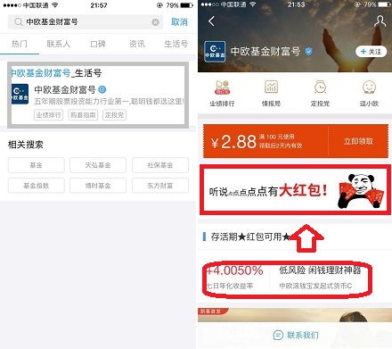 1.打开手机支付宝,搜索“中欧基金财富号”,进入后如下图点击“大红包”