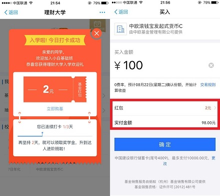 中欧基金财富号是支付宝里面的一个服务号,目前正在举办“理财大学开课啦,涨知识,领红包”活动,每天签到可领取基金红包,一般2-3元,这个红包不能直接提现,但能购买活期基金tx,每天坚持套一个,到结束时也能赚几十元!