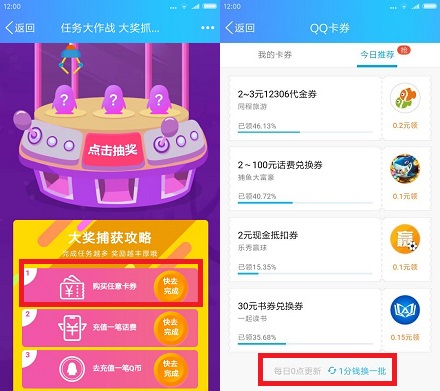 2.进入后,点击购买任意卡券的“快去完成”但不用真的买卡券,再点击底部的“1分钱换一批”。