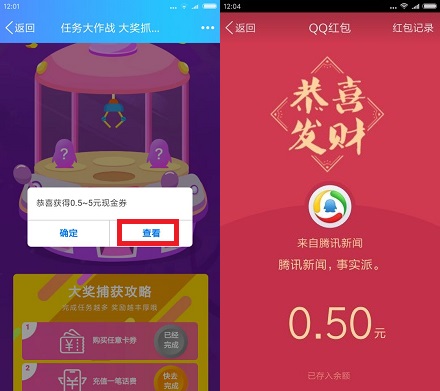 3.支付成功后,回到活动页面点击抽奖,一般都会提示你获得0.5-5元现金券。点击“查看”按提示安装“腾讯新闻”app。