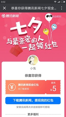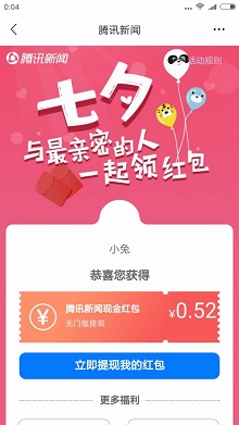 微信也在做免费领取红包的活动了,类似前面推荐的手机QQ活动,也是联合腾讯新闻,需要下载app,抽到的金额随机0.5-5元,秒推微信红包。千万记得要用微信活跃号参与,不然会跟我一样,抽到红包无法提现,白白浪费机会!