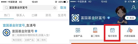 1.打开手机支付宝,搜索“富国基金财富号”进入后点击“每日签到”