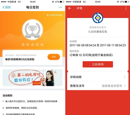 2.连续签到5天后,即可获得5元基金红包。