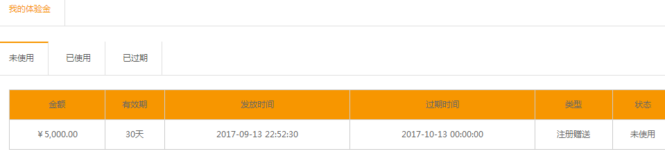 2.在“我的体验金”可看到5000元体验金已经到账,有效期一个月!