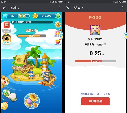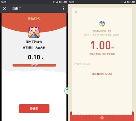 猫来了是爱微游旗下的一款手机游戏,不用下载,在微信里即可操作。目前,新用户玩游戏达到指定要求后,可免费领取1元微信红包。游戏当然是非常简单,不用你动脑,一通乱点,几分钟即可达到要求。邀请好友可以获得更多红包!