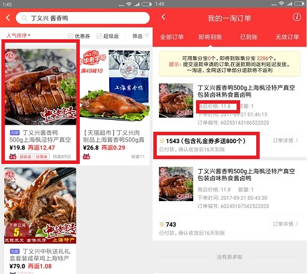 5.在一淘搜索“丁义兴酱香鸭”,找到19.8元的那个,记得先看是否显示的超级返,和下图一样。