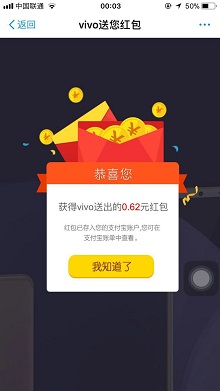 打开支付宝AR扫一扫,对准vivoX20新品代言人海报图片,扫描代言人形象,即可免费领取vivo发放的百万现金红包,100%中奖哦,领完未知。亲测领到了0.62元,不过每个支付宝只能领取一次!
