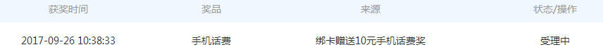 在“账户奖励”-“奖励记录”可看到10元话费显示受理中。