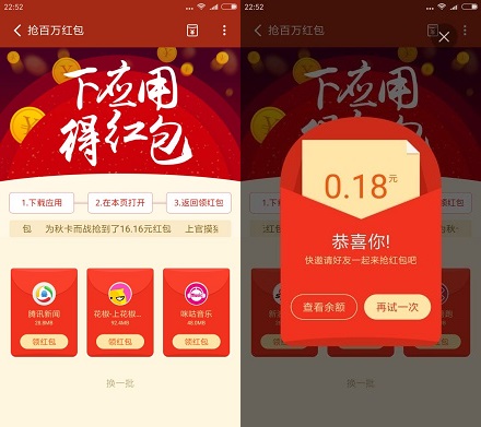 3.进入后,可看到系统随机推荐三款app,随便下载2个并按提示打开,返回拆开红包即可。