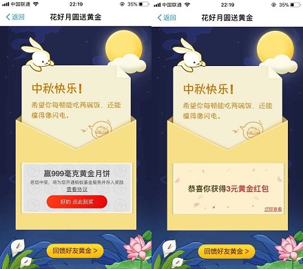 支付宝正在举办“花好月圆送黄金”活动,使用支付宝AR,扫花或扫月亮成功后可以发给好友,好友一般能拆到8-999毫克黄金或者3元黄金红包,黄金是虚拟的可以卖成现金,红包也可以tx。所以你参与这个活动,必须有2个支付宝,或者找个朋友相互发一下。