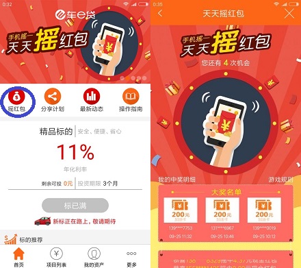 车e贷是青岛盛世闽商投资管理有限公司旗下的专注汽车融资平台,目前新用户注册为会员后,有4次免费摇红包的机会,每次必中0.5元以上,亲测4次抽中6.42元,可直接提现。据反馈,一般人这4次都会累计到5元以上,而且每天都可以免费摇红包!