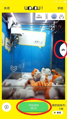 返回到主页,找到你想抓的娃娃进入,最低19娃娃币抓一次。如下图,跟真实抓娃娃场景一样,点击右侧红色标注的位置可以切换摄像头视角,点击下方“开始游戏”即可开始抓娃娃了。