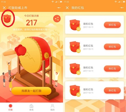 2.进入小程序后,点击屏幕开始敲锣打鼓,打差不多200下左右,再点击左上角的红包图标进入。
