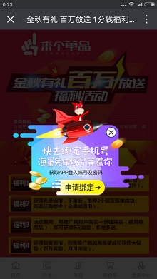 2.关注公众号后,点击菜单栏“1分抢购”进入,先按提示注册绑定手机号。