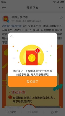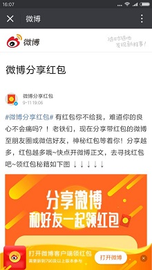 3.自动跳转到微博后,会出现获得红包的提示,如果没提示,退出微博帐号重新试试,还不行就是结束了。