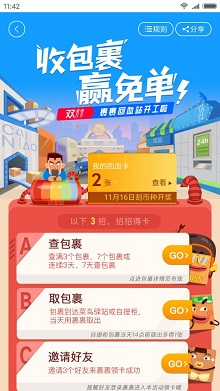 双十一的余温渐渐散去,大家都开始每天等着收包裹了。阿里巴巴旗下的快递查寄软件:菜鸟裹裹,也开始做活动。用户可以通过app相关任务,免费领取回血卡,在11月16日开奖时可抽中0.3-9999元现金红包,可以用来在淘宝或者天猫购物抵扣现金!