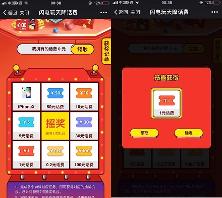 闪电玩这个有钱任性的公众号,又开始免费送话费了,这次虽然说是“天降话费”第一期的活动,但之前也送过几波了,跟以前一样,只需要在微信里玩一个简单的游戏,即可获得1次机会,首次100%免费领取1元话费!