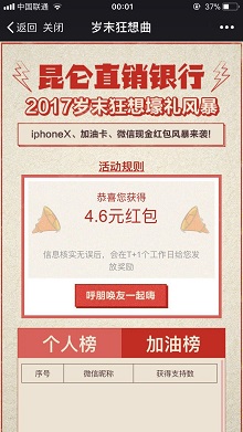 昆仑银行正在举办“2017年岁末狂想壕礼风暴”活动,新老用户均可免费参与活动,一般都是抽中3.8-100元现金红包,亲测抽到了4.6元,红包奖励会在T+1个工作日发放到参与活动的微信号里!