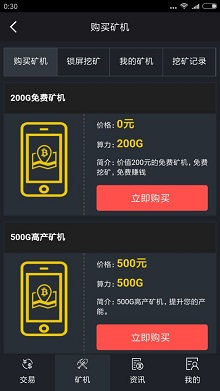 3.回到app里,点击“矿机”-“立即购买”200G免费矿机。到时点击“我的”-“锁屏挖坑”即可开始免费挖坑了!