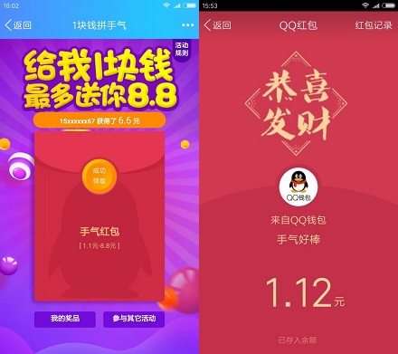 QQ钱包正在举办“给我1块钱最多送你8.8”的活动,说是仅限钱包新用户参加,但是我之前也多次参与QQ钱包活动,这次亲测依然可以领取到,我支付了1元,成功抽到1.12元,相当于赚了0.12元!