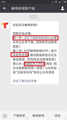 2.关注后,会自动推送来活动详情,按提示下载安装app。