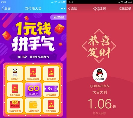 QQ钱包“1元钱拼手气”活动又来了,每日1次,支付1元首次99%得1-88元红包,亲测中了1.06元,扣除支付的1元,相当于赚了6分钱。好歹之前至少能赚一毛以上啊,现在真是成了抠抠钱包了。